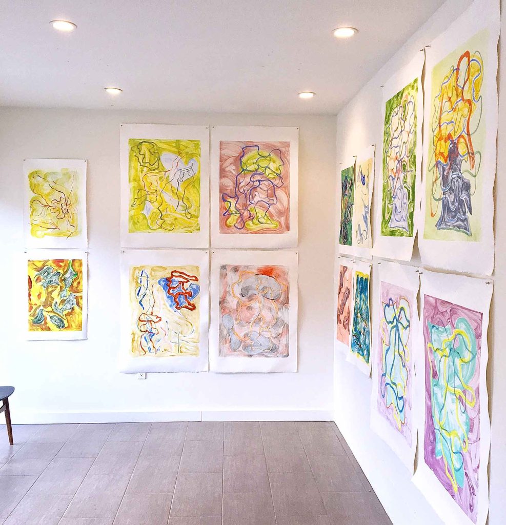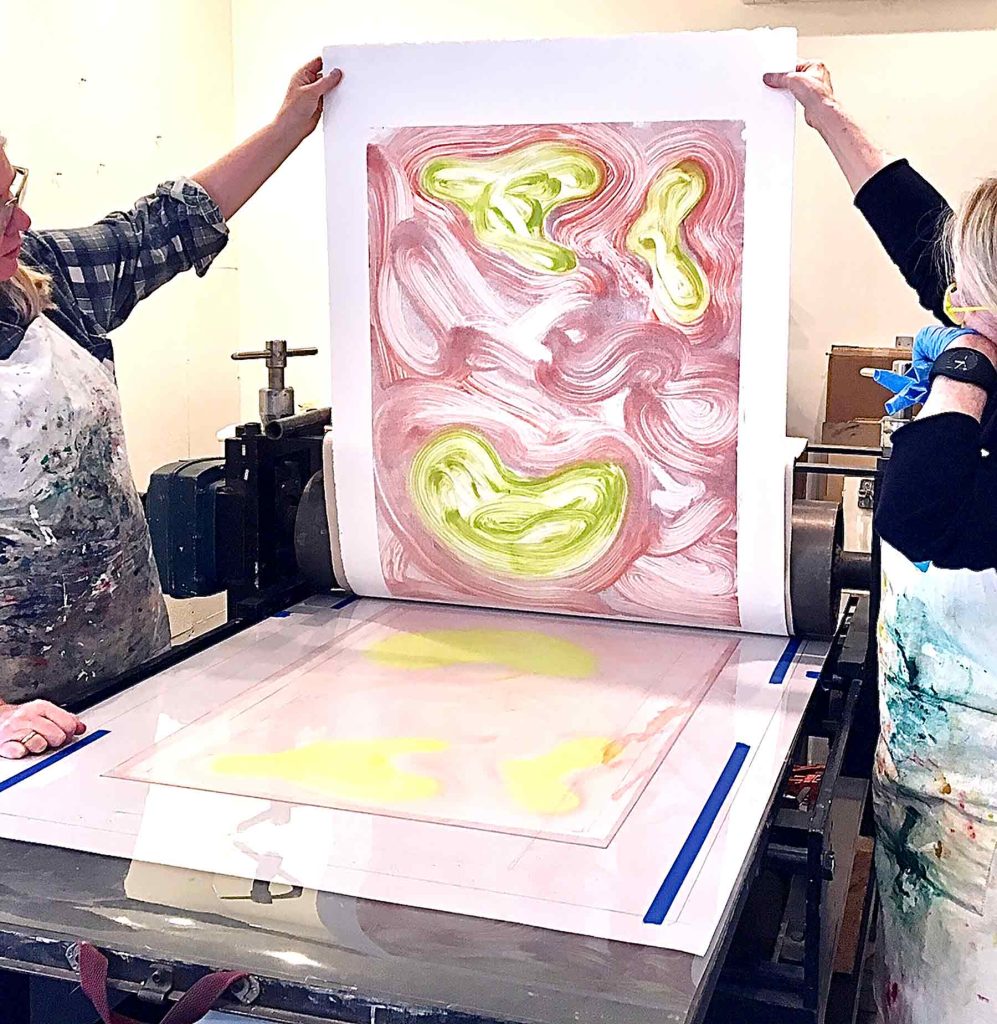 Painter Wendy Edwards spent three days at the Russell Janis studio creating a series of monotypes on the press with master printer Janis Stemmermann. Bringing along brushes from her studio and a color palette familiar to her, she took on this first-time monotype experience, producing a beautiful new series of works layering bold and subtle brushstrokes and color. Come see them – they are wonderful – on exhibit through April 2018.